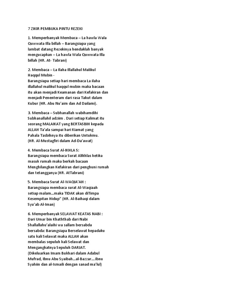 Bacaan zikir wirid pembuka pintu rezeki berlimpah dalam waktu singkat diwaktu sebelum sholat shubuh: A little about the app 7 zikir pembuka pintu rezeki. Zikir istighfar pembuka pintu rezeki penenang hati & pikiran astaghfirullah hal adzim alladzi la ilaha illa huwal hayyul. Memperbanyak membaca la hawla wala quwwata illa billah barangsiapa yang lambat datang rezekinya hendaklah banyak mengucapkan la hawla wala quwwata illa billah (hr. Download lagu 7 zikir pembuka pintu rezeki mp3 dapat kamu download secara gratis di metrolagu.